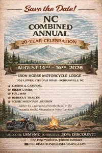 This year is North Carolina’s 20th Anniversary and one party that you won’t want to miss. We will be having our combined annual at the Iron Horse Motorcycle Lodge in Stecoah NC Aug 14-16. If you’re wondering where that is, it’s over in the mountains of western North Carolina. Make your reservations before April 1st and get 30% off! DO NOT try to book online. Our weekend is blocked for us and the only way to make your reservation is to email or text.