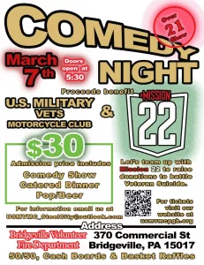 Steel City’s annual Comedy Night. For the last seven years we have partnered with Mission 22 to raise a donation that shows we are serious about helping military veterans fight suicide.